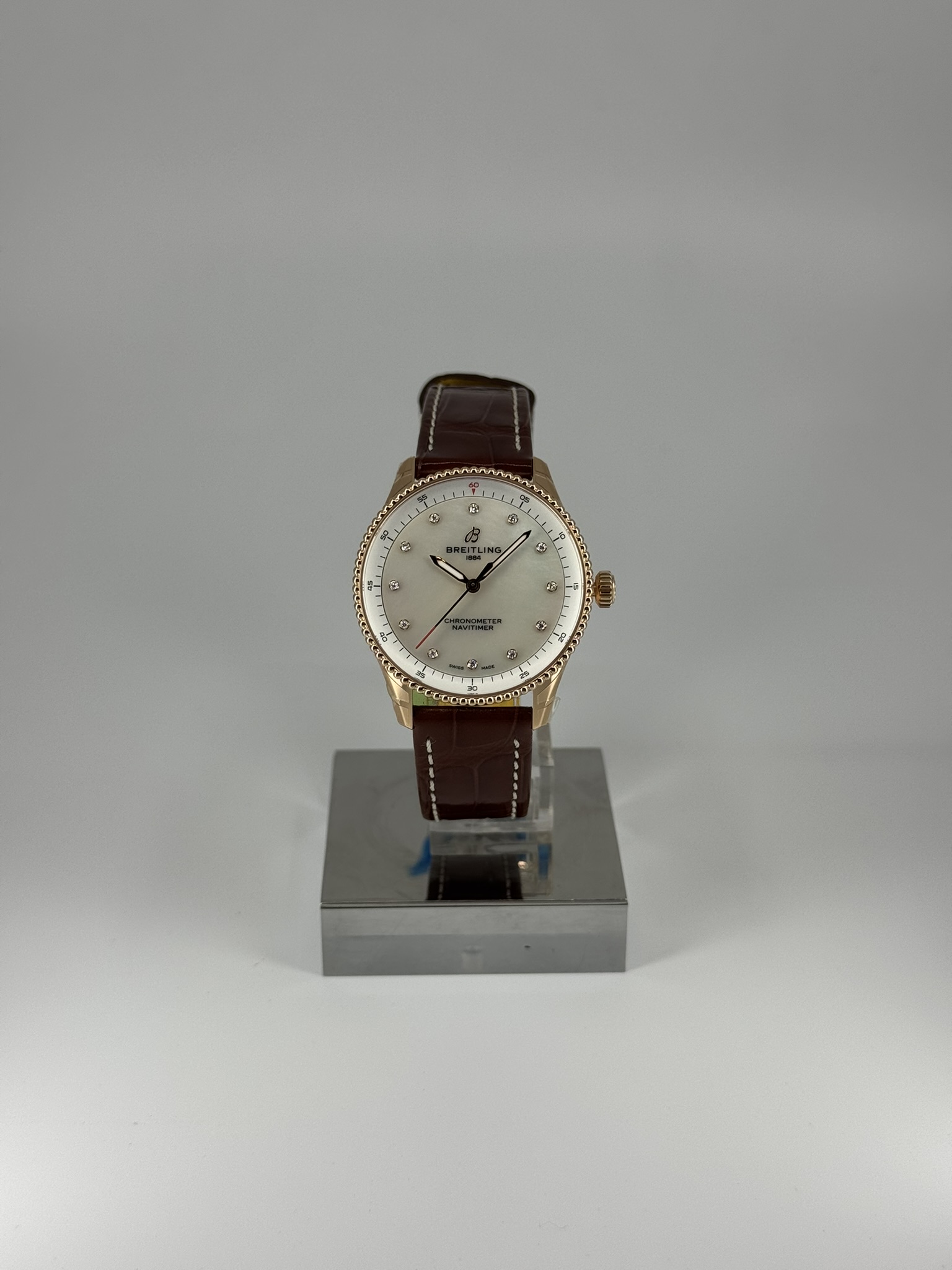 Wijzerplaat: elegante kleur parelmoer, voorzien van met briljanten indexen